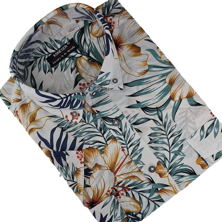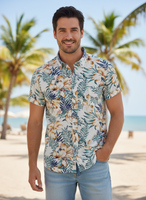Nasza koszula męska w hawajskim stylu to idealny wybór dla każdego, kto ceni sobie wygodę, modny wygląd i letnią swobodę. Białe tło w połączeniu z zielonymi liśćmi palm oraz tropikalnym wzorem sprawia, że koszula przyciąga wzrok i doskonale wpisuje się w wakacyjne trendy.