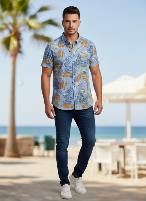 Nasza koszula męska w hawajskim stylu to idealny wybór dla każdego, kto ceni sobie wygodę, modny wygląd i letnią swobodę. Białe tło w połączeniu z zielonymi liśćmi palm oraz tropikalnym wzorem sprawia, że koszula przyciąga wzrok i doskonale wpisuje się w wakacyjne trendy.