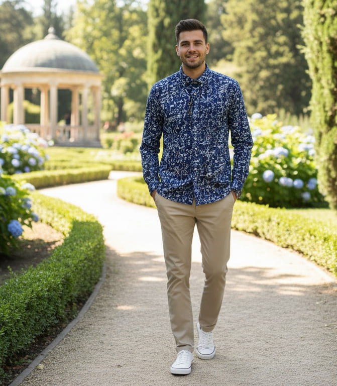 Koszula charakteryzuje się klasycznym krojem, który dobrze leży na każdej sylwetce. Roślinne wzory dodają jej nowoczesnego charakteru, co pozwala na łatwe zestawienie z różnymi elementami garderoby. Koszula pasuje zarówno do spodni chinos, jak i jeansów, co czyni ją wszechstronnym elementem męskiej mody.