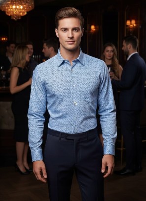Elegancka Wzorzysta niebieska koszula slim. Oferujemy kolekcję eleganckich koszul męskich slim fit, które łączą wysoką jakość, styl i wygodę. Nasze bawełniane koszule dostępne są w różnych kolorach i wzorach, co sprawia, że każdy mężczyzna znajdzie coś dla siebie. Dzięki dobrze dopasowanym koszulom slim fit, które są idealne zarówno na formalne, jak i codzienne wyjścia, warto je mieć w swojej garderobie.