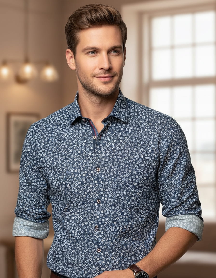 Koszula charakteryzuje się klasycznym krojem, który dobrze leży na każdej sylwetce. Roślinne wzory dodają jej nowoczesnego charakteru, co pozwala na łatwe zestawienie z różnymi elementami garderoby. Koszula pasuje zarówno do spodni chinos, jak i jeansów, co czyni ją wszechstronnym elementem męskiej mody.