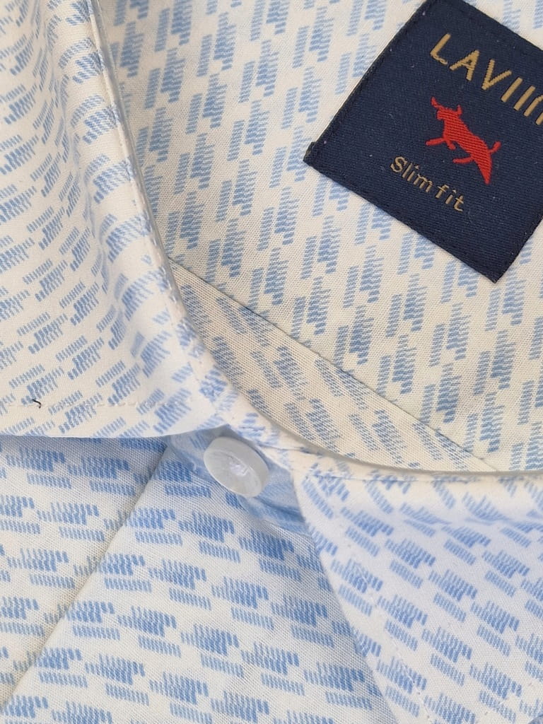 Klasyczna Elegancka biała koszula slim z niebieskim wzorem. Oferujemy kolekcję eleganckich koszul męskich slim fit, które łączą wysoką jakość, styl i wygodę. Nasze bawełniane koszule dostępne są w różnych kolorach i wzorach, co sprawia, że każdy mężczyzna znajdzie coś dla siebie. Dzięki dobrze dopasowanym koszulom slim fit, które są idealne zarówno na formalne, jak i codzienne wyjścia, warto je mieć w swojej garderobie.