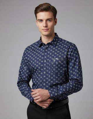 Stylowa Wygodna granatowa koszula slim z wzorem. Oferujemy kolekcję eleganckich koszul męskich slim fit, które łączą wysoką jakość, styl i wygodę. Nasze bawełniane koszule dostępne są w różnych kolorach i wzorach, co sprawia, że każdy mężczyzna znajdzie coś dla siebie. Dzięki dobrze dopasowanym koszulom slim fit, które są idealne zarówno na formalne, jak i codzienne wyjścia, warto je mieć w swojej garderobie.